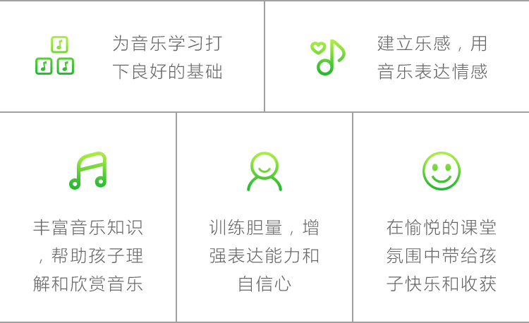 趣味视唱练耳课旨在挖掘孩子巨大的音乐潜能,帮助TA掌握乐谱以及音乐听、唱方面的知识,为TA的音乐学习打下扎实的基本功。